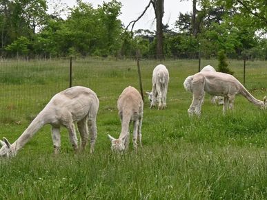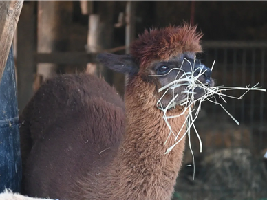 Alpacas eat a lot of forage, such as grass and hay. Since they are from South America where there are different minerals in the soil than what's found in the U.S., we also add dietary supplements to their feed to provide those nutrients.